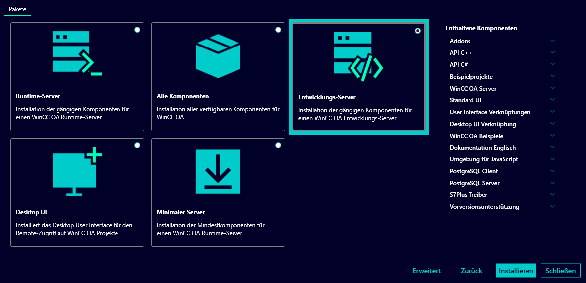 Der WinCC OA Setup-Prozess wird mit Hilfe eines Assistenten durchgeführt. Das Installationsprogramm zeigt während der Installation die Versionsnummer an. Zur Installation der WinCC OA-Komponenten führen Sie die folgenden Schritte aus: