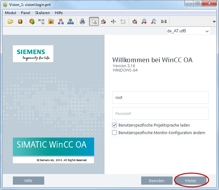In the login.pnl the "btn_action" button opens another child panel, either the "System use notification" if it was activated or a vision panel. For projects the first panel is usually a top-level diagram or control diagram of the system. The panel topology can be used to open the panels in the desired order, see panel topology for more information.