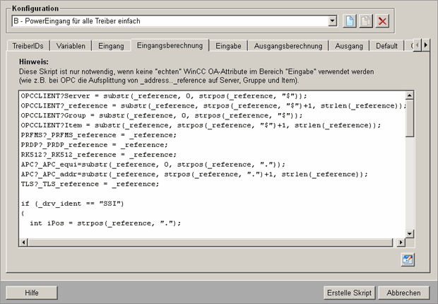Auf dieser Registerkarte definieren Sie (optional) ein Skript, das die aktuellen Werte der DPEs einer Berechnung unterzieht, bevor sie im Parametrierpanel (siehe PowerConfig-Parametrierung am Datenpunkt) angezeigt werden. Das Skript, welches die aktuellen Werte der DPEs ausliest finden Sie auf der Registerkarte Eingang. Als Beispiel wird das Attribut _address.._reference bei einer OPC-Peripherieadresse aufgeteilt in Server, Gruppe, Item und auf Variablen geschrieben. Damit kann im Bereich "Eingabe" jedes dieser Teile als dynamisches Attribut verwendet werden.