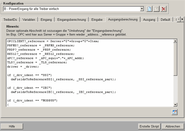 Diese Registerkarte ist funktionell invers zur Registerkarte Eingangsberechnung. Der eingestellte Parameter (im Parametrierpanel) wird vor dem Setzen einer Berechnung unterzogen. Die gewünschte Berechnung können Sie in diesem Bereich mit einem Skript bestimmen. Als Beispiel wird das Attribut _address.._reference bei einer OPC-Peripherieadresse wieder aus den Elementen Server, Gruppe und Item zusammengestellt.
