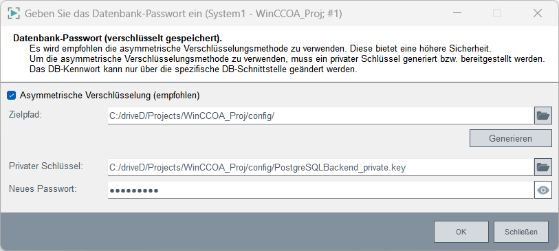 Klicken Sie in das Feld Passwort, um das Passwort zu ändern. Das Datenbank-Passwort-Fenster wird geöffnet. Generieren Sie gegebenenfalls einen privaten Schlüssel für die asymmetrische Verschlüsselungsmethode über die Generieren-Schaltfläche. Die Checkbox für die asymmetrische Verschlüsselung ist nur aktiviert, wenn der private Schlüssel konfiguriert und ein Passwort angegeben ist. Für mehr Information zu der Generieren-Schaltfläche, siehe Kapitel Asymmetrische Verschlüsselung.