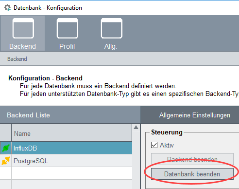 - Stoppen und Starten Sie die InfluxDB® mit Hilfe des Datenbank-Konfigurationspanels erneut.