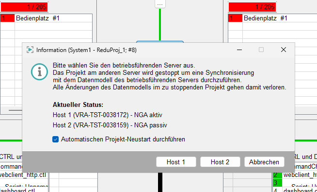 Sie können außerdem auswählen, ob die Gegenseite automatisch neu gestartet werden soll, um mit der ausgewählten Seite zu synchronisieren (Checkbox Automatischen Projekt-Neustart durchführen), oder einfach gestoppt werden soll, sodass sie später manuell gestartet werden muss. Die Checkbox Automatischen Projekt-Neustart durchführen ist standardmäßig aktiviert.