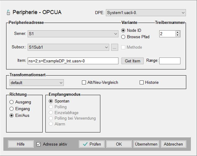 Im Falle eines Float Datentyps am OPC UA Server, muss die Transformationsart in WinCC OA explizit eingestellt werden (default ist hier nicht zulässig).