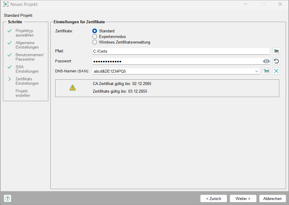 Feld, um sichere Zertifikate für die SSA zu erstellen.