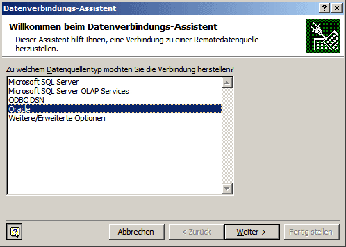 Dazu wählt man im Menü Daten den Menüpunkt Externe Daten importieren und danach den Punkt Daten importieren... . Im sich darauf öffnenden Dialog des Datenverbindungs-Assitents wählt man die Schaltfläche Neue Quelle... und erhält damit die Möglichkeit den Datenquellentyp Oracle auswählen zu können.
