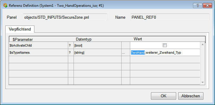 Dem $-Parameter "$sTypeNames" müssen die Typnamen aller Objekte angegeben werden, die von der Zweihandbedienung angesprochen werden sollen. Die Typnamen müssen durch Semicolons (;) getrennt eingegeben werden.