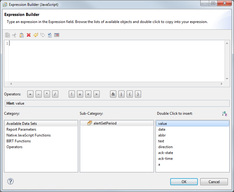 Unter Expression legen Sie die fest, was in der Spalte ausgegeben werden soll. Der Expression Builder erlaubt es, per Doppelklick die vorhandenen Datensätze und Funktionen einzufügen. Nach abgeschlossener Konfiguration scheint die Spalte ebenfalls unter Output Columns auf.