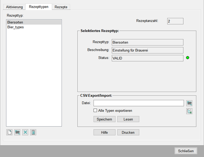 Im linken Bereich werden alle bestehenden Rezepttypen angezeigt. Rechts sind die zum selektierten Typ gehörigen Informationen zu finden: