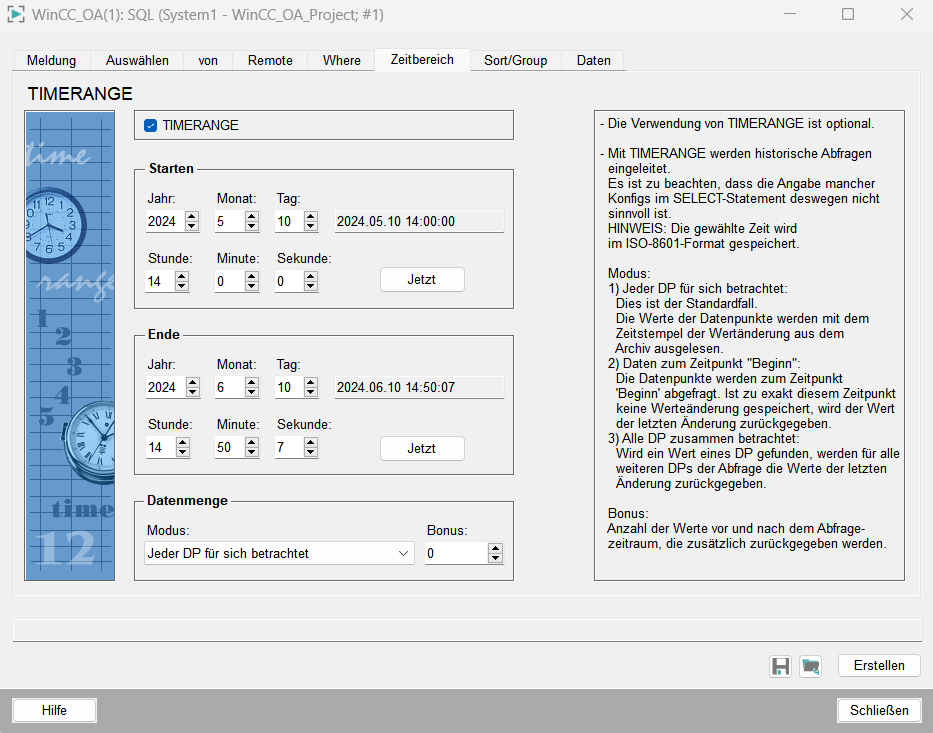 Auf der Registerkarte Timerange kann ein Zeitbereich gesetzt werden. Der Parameter Modus wird anders als mit Wert = 1 ("Jeder DP für sich betrachtet") nicht mehr unterstützt.