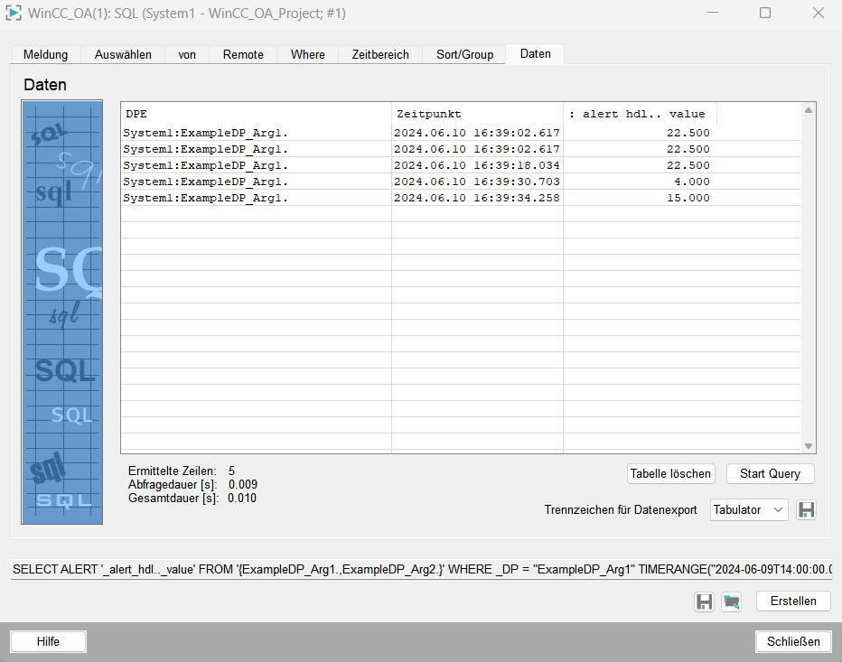 Auf dieser Registerkarte wird das Ergebnis der Abfrage dargestellt. Mit der Taste Start Query startet die Abfrage an die DB und die Taste Tabelle löschen löscht die Anzeige. Ermittelte Zeilen und die Abfragedauer in Sekunden werden ebenfalls angezeigt, sowie die Gesamtdauer inkl. Listenaufbau. Der zuvor erstellte Query-Befehl wird in der untersten Zeile des SQL-Panels angezeigt. Um eine Abfrage zu erstellen, klicken Sie auf die Schaltfläche Erstellen. Dieser kann abgespeichert und ggf. in eigenen Control-Scripts weiter verwendet werden.