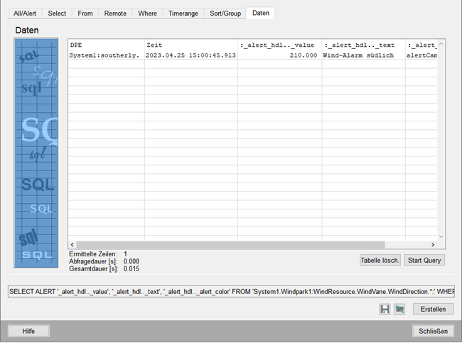 SELECT ALERT '_alert_hdl.._value', '_alert_hdl.._text', '_alert_hdl.._alert_color' FROM 'System1.Windpark1:WindResource.WindVane.WindDirection.*:' WHERE _DP = "southerly"Die Abfrage wird ausgeführt und der Alarm des Datenpunktknotens southerly (südlich) wird gezeigt. Die Zeit, die Farbe und Text des Alarms werden angezeigt: