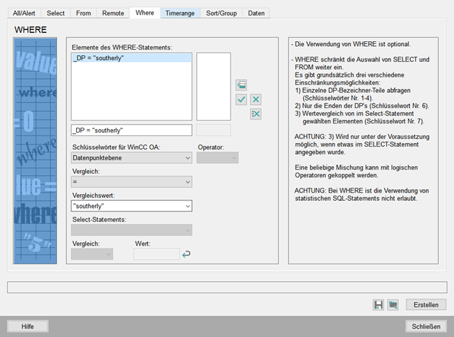 - Öffnen Sie die Registerkarte Where und wählen Sie die Datenpunktebene aus der Schlüsselwörter für WinCC OA-Checkbox. Wählen Sie dann den Vergleich = (ist gleich). Für den Vergleichswert wählen Sie den Datenpunkt