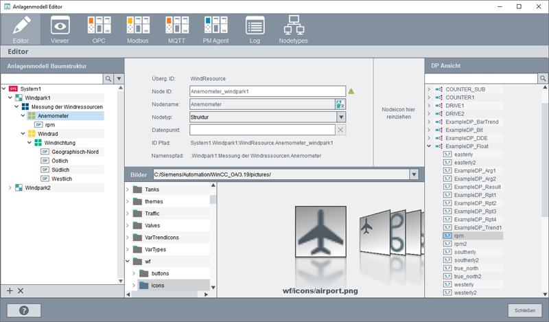 - Fügen Sie die Datenpunkte per Drag&Drop aus der DP-Ansicht auf der rechten Seite zu Ihren Anlagenmodellknoten hinzu. Ziehen Sie einen Datenpunkt auf den Datenpunkt-Feld.