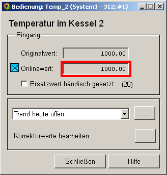 Original- und Onlinewert sind in den oberen beiden Feldern dargestellt. Der rote Rand zeigt eine ausgelöste Meldebehandlung des Onlinewertes an.
