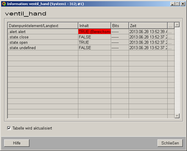 Die Tabelle enthält alle Datenpunktelemente, entweder mit Namen oder Langtext, deren Werte (Inhalt), ihren Status (Bits) und die Quellzeit. Die Schaltflächen "..." öffnen Detailinformationen zu Ereignis oder Meldung (siehe Meldetabelle).