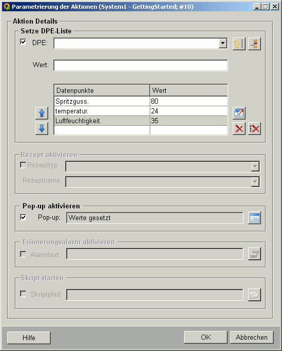 Parametrierung der Aktionen