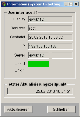 Bei den UIs können verschiedene Einstellungen und Parametrierungen durchgeführt werden. Durch Klick mit der linken Maustaste auf ein Monitor-Symbol öffnet sich ein Panel, das allgemeine Informationen wie Startzeit, Benutzer, Display (Rechnername auf dem das UI aufgeschaltet läuft), IP-Adresse des Rechners zum ausgewählten User Interface und im unteren Bereich der Rechnername (wo der Event-Manager läuft) bzw. Verbindung (Link) zum Event-Manager anzeigt (diese Infos sind nur lesbar):