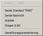 Der Status des UIs (läuft/gestoppt) wird als erster Eintrag im Kontextmenü ausgegraut dargestellt. Der Eintrag Sende Standard "PING" öffnet ein Terminalfenster und verschickt einen Standard PING Befehl auf den Rechner, auf dem das UI läuft. Damit kann die Netzwerkverbindung zu dem Rechner überprüft werden (z.B. bei langen Panel Aufschaltzeiten kann die Verbindung zum spezifischen Rechner kontrolliert werden).
