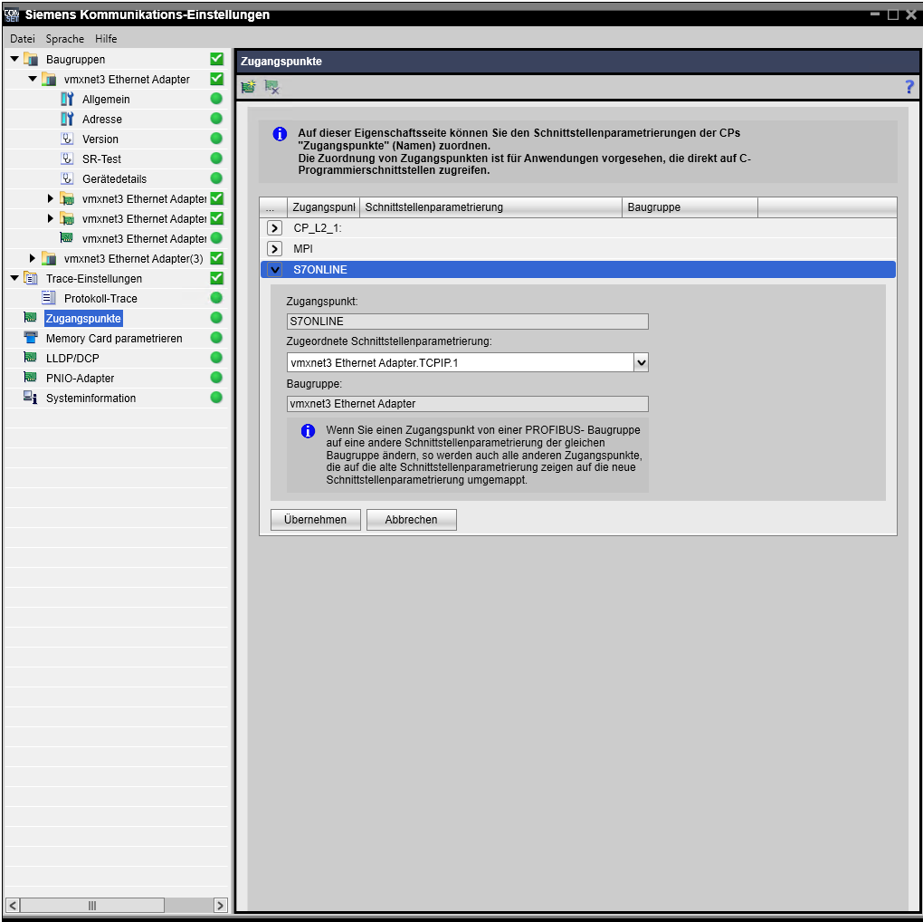 Geben Sie den Zuganspunkt ein und wählen Sie die zugeordnete Schnittstellenparametrierung. Das Feld Baugruppe wird automatisch ausgefüllt. Klicken Sie auf Übernehmen, um Ihre Einstellungen zu speichern. Weitere Informationen finden Sie in der CommunicationSettings-Hilfe im CommunicationSettings-Installationsverzeichnis, z. B. C:\Program Files\Common Files\Siemens\CommunicationSettings\CommunicationSettings.exe.