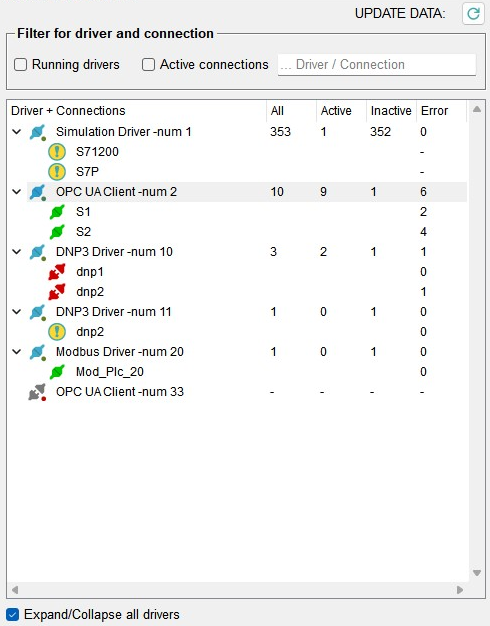 Unterhalb des Bereiches befindet sich die Checkbox Alle Treiber auf-/zuklappen, mit der alle Treiber und Verbindungen schnell voll angezeigt oder auf die Übersicht reduziert werden können.