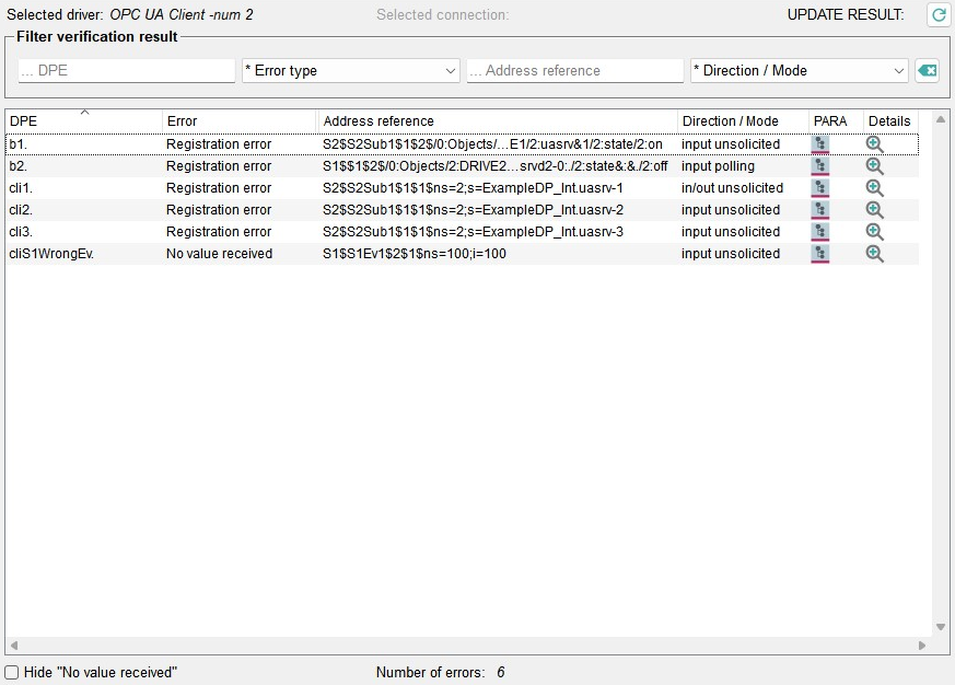 Unterhalb des Bereiches wird die Gesamtanzahl der derzeitigen Fehler angezeigt. Mittels der Checkbox "Kein Wert empfangen" ausblenden werden Verbindungen, die keinen Wert empfangen haben, ausgeblendet um die Übersichtlichkeit zu erhöhen.