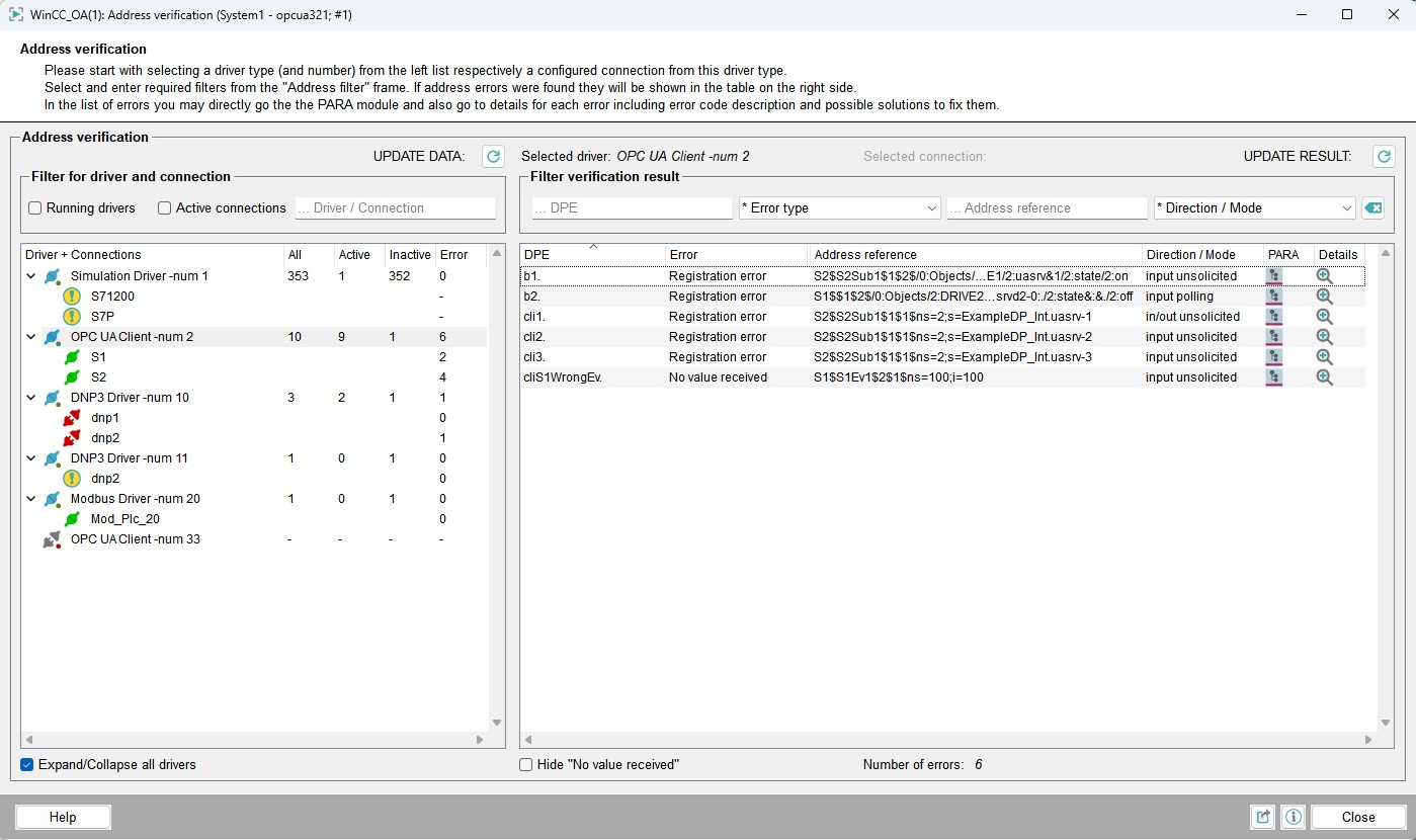 Das Panel Adressüberprüfung kann über aufgerufen werden. Es bietet einen Überblick über alle aktuellen Treiber und ihre Verbindungen, sowie den aktuellen Status beider. Durch Auswahl eines Treibers oder einer Verbindung im linken Fensterbereich können Sie falsche Adressen für das ausgewählte Element abfragen.