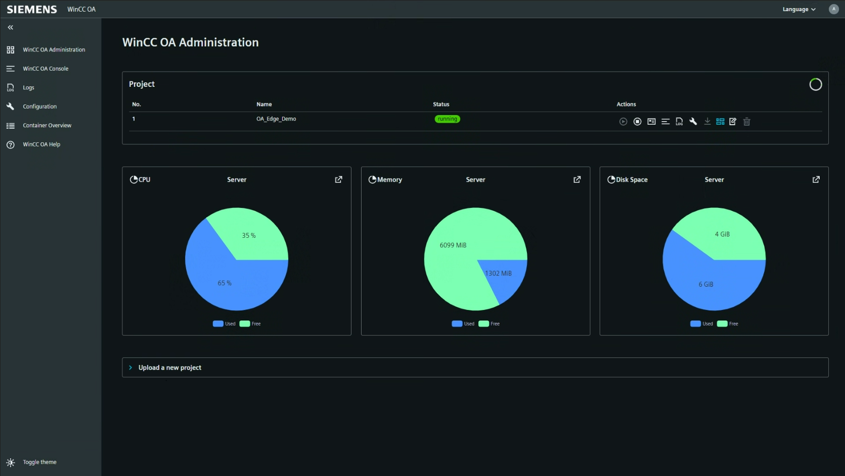 - Upload Demo Project – Lädt das WinCC OA Industrial Edge Demo Project auf Ihr Gerät.