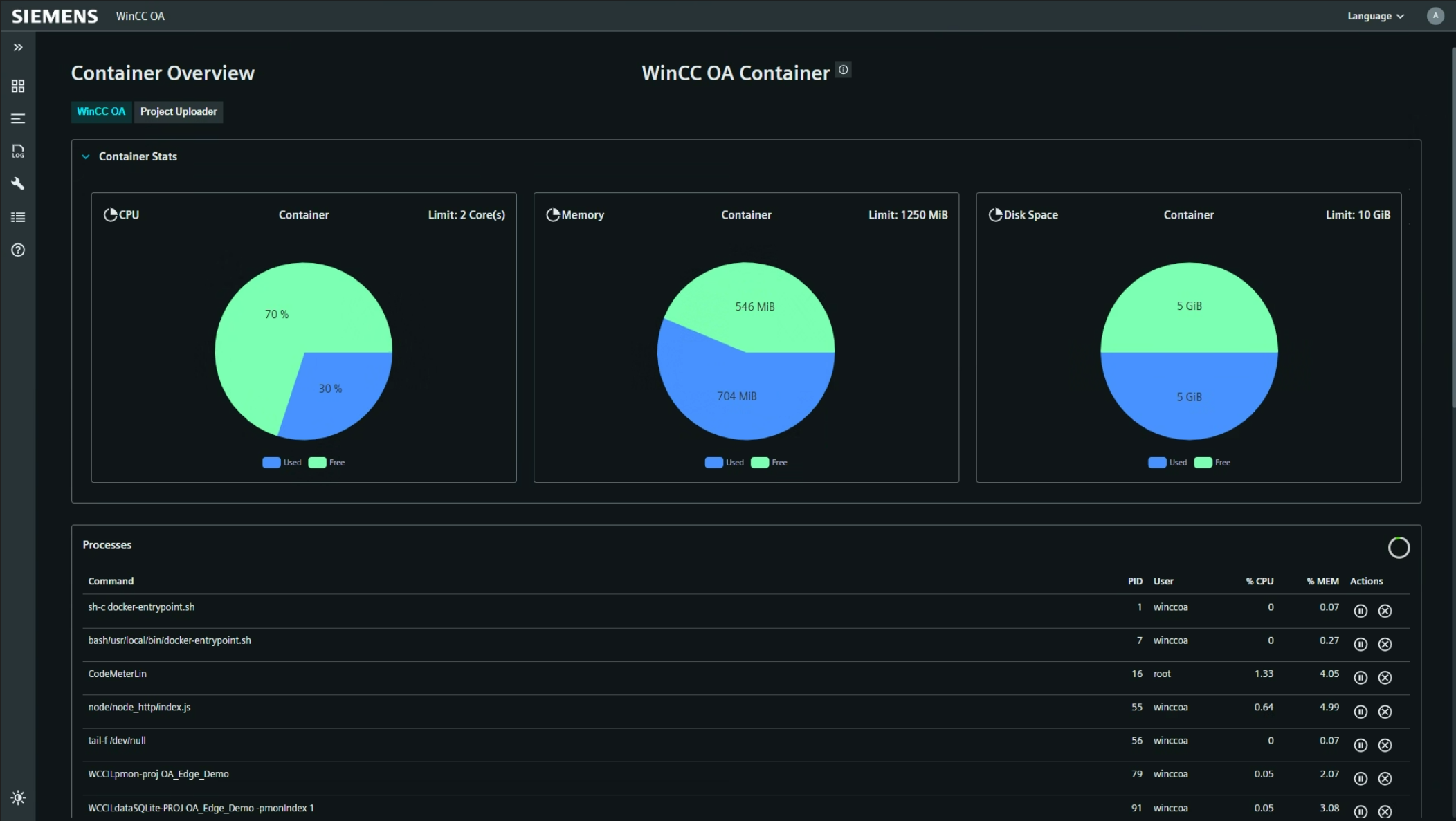 Der Bereich Container Overview zeigt Leistungsindikatoren und laufende Prozesse innerhalb des WinCC OA Containers auf dem Edge-Gerät. Der Bereich umfasst: