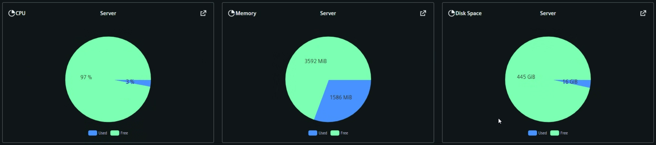Der Bereich Device Performance bietet Echtzeit-Anzeigen für CPU-, Speicher- und Festplattennutzung auf dem Server. Jeder Indikator wird als Kreisdiagramm angezeigt, das die verwendeten und freien Ressourcen darstellt.