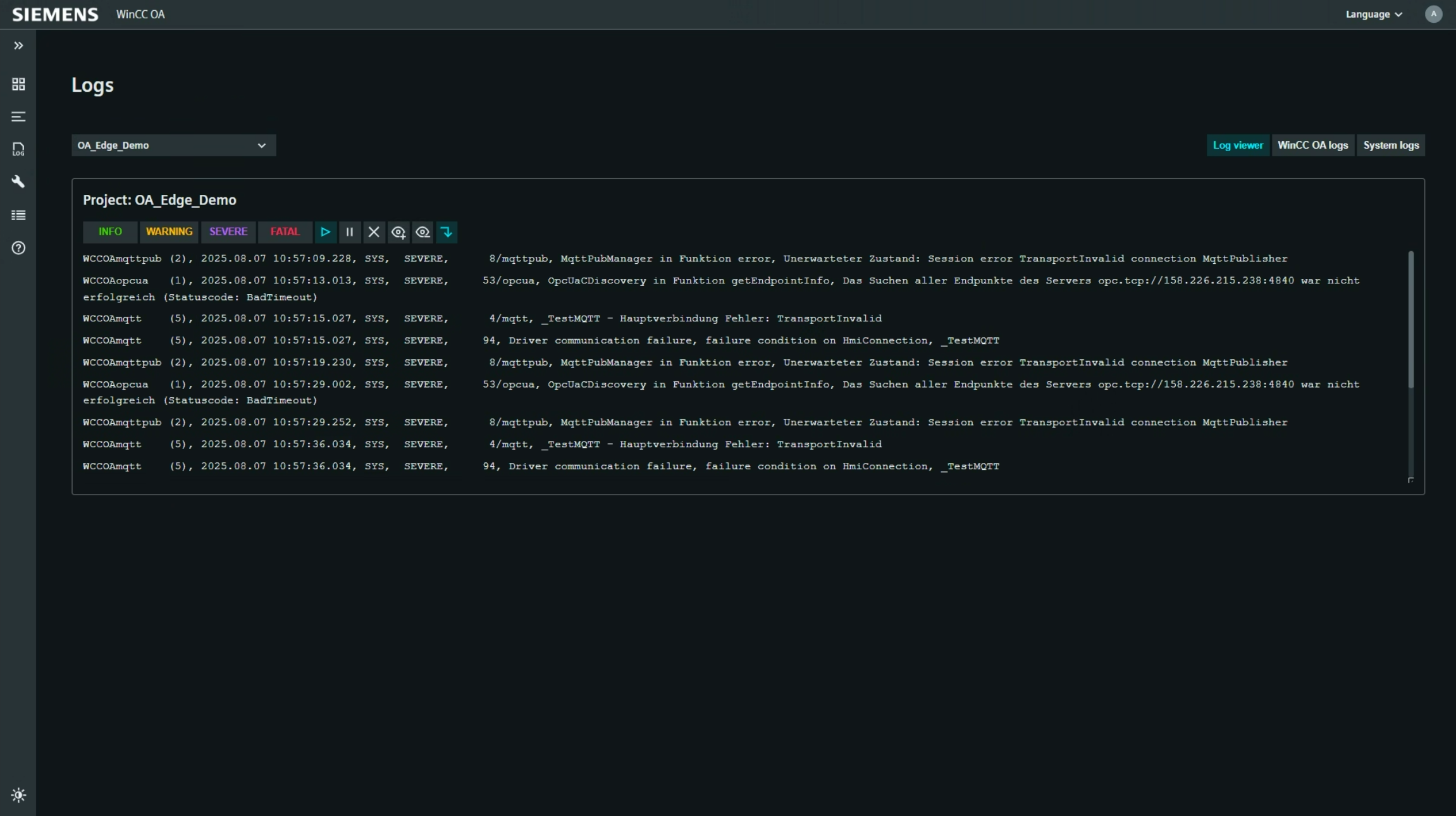 Über die Tabs oben rechts können Sie zwischen Log viewer, WinCC OA logs und System logs wechseln.