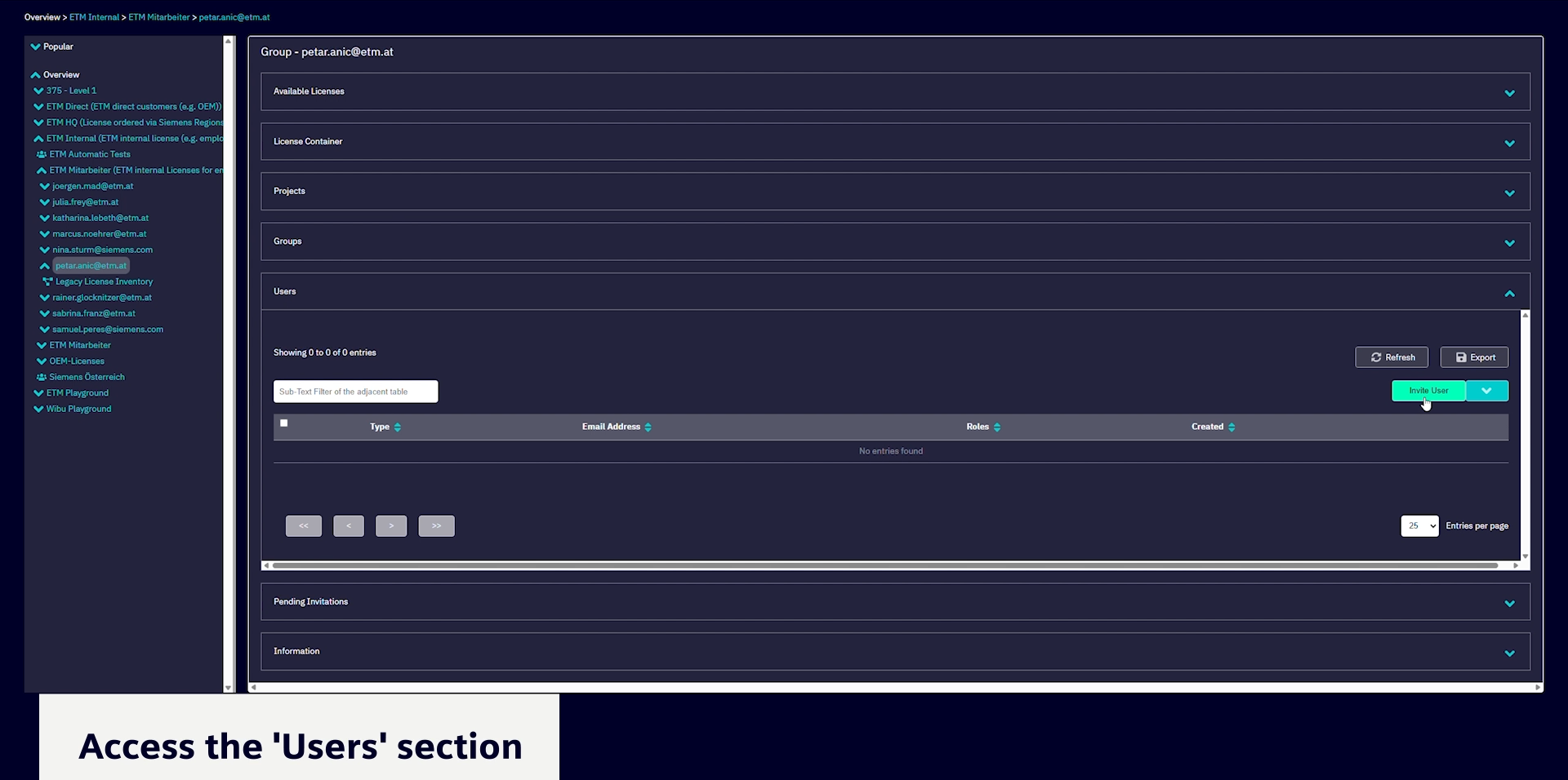 Das Hinzufügen eines neuen Benutzers zu Ihrer Gruppe im WinCC OA Lizenzportal ist ein unkomplizierter Vorgang, der sicherstellt, dass Teammitglieder schnell und korrekt eingerichtet werden.