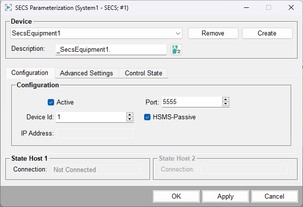 - Kontrollkästchen, das konfiguriert, ob das Gerät HSMS-aktiv (TCP-Client) oder HSMS-passiv (TCP-Server) ist.