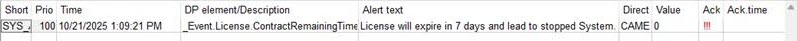 | Gültig | Lizenzaktualisierung erfolgreich | <kein Alarmtext> | |