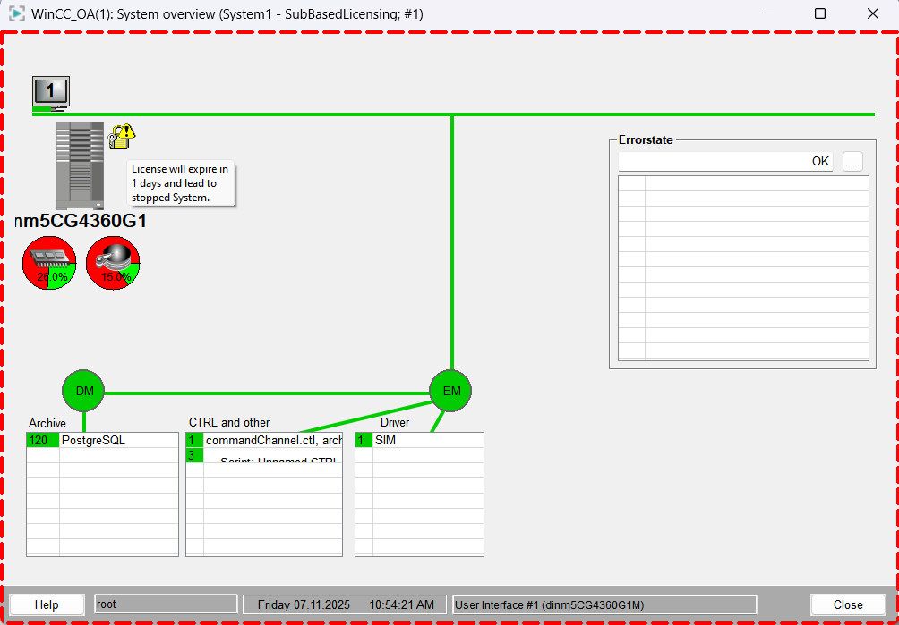 - Innerhalb Ihres WinCC OA-Projekts erhalten Sie auffällige, unübersehbare Benachrichtigungen bereits 7 Tage vor Ablauf Ihres Lizenzvertrags. Diese Alarme sind so klar und dringlich gestaltet wie unsere Notfallmodus-Benachrichtigungen, sodass Sie immer ausreichend Zeit zur Verlängerung haben: