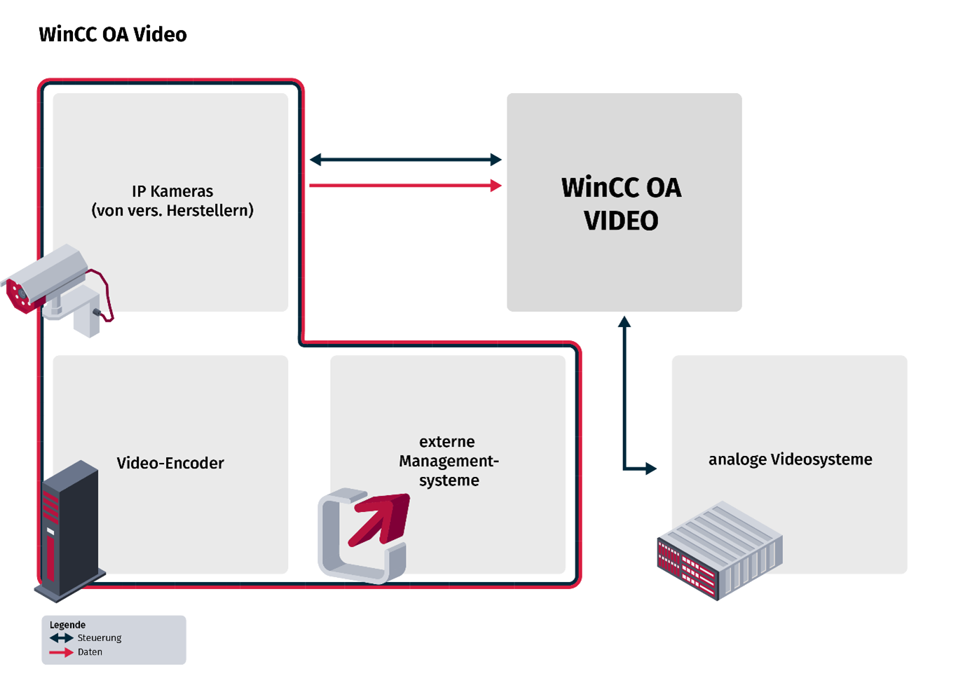 WinCC OA Video ist eine universelle Videomanagementsoftware, die zur Übertragung, Anzeige, Auswertung und Archivierung von Videodaten sowie zur Steuerung von Videotechnik wie Kameras und Schaltkontakten in einem digital vernetzten CCTV-System dient.