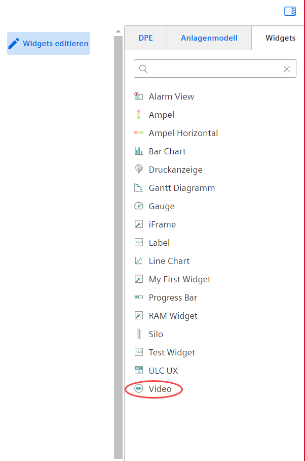 - Öffnen Sie das Video-Widget im Dashboard - siehe auch die Dashboard-Doku. Um das Video-Widget im Dashboard zu öffnen, fügen Sie das Video-Widget zum Dashboard wie folgt hinzu: