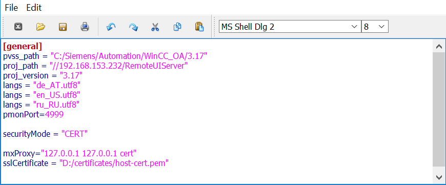 Defines the security mode (CERT, WINCERT). See the description of the config entry. If security mode WINCERT is configured, the config entry winCert determines which certificate from the Windows Certificate Store is used for SSL/TLS communication. If security mode WINCERT is configured, the config entry winRootCA determines which certificate from the Windows Certificate Store to be used for certificate verification during SSL/TLS session negotiation. Please see the description of the SecurityMode entry. The mxProxy specifies the WinCC OA server host as well as the MXProxy host. |