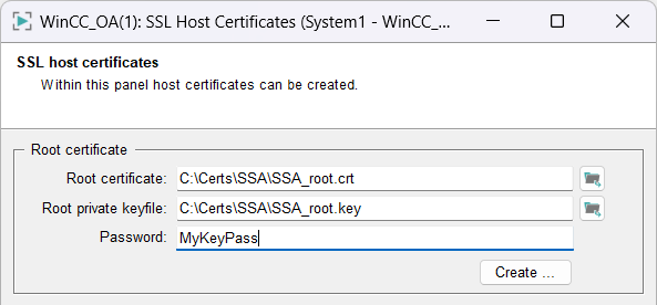 Path to the private key file that is being used for the host certificate. This key is only required for creating the Root Certificate Authority certificate and public host certificates. WinCC OA does not need this file to authenticate the manager and the connections.