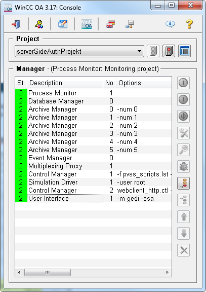 Start the server project. Add the -ssa option so that the client can connect to the WinCC OA HTTP server and add the webclient_http.ctl script to the project. See figure below (here the local computer localhost is used as server):
