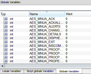 At the bottom of the main panel, local variables, script local variables and global variables are shown. These can also be edited here. This means you can set values for the variables (see second figure below). Note that constants are not shown.