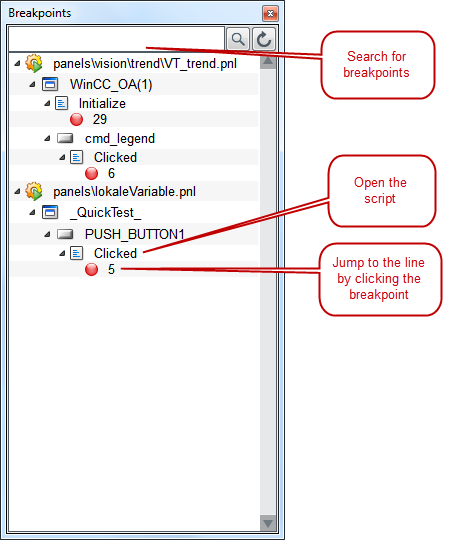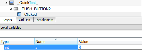 In the following, a breakpoint was set for the function dpSet on the line 28 in the "clicked" event as well as on the line 31 of the button2 in the "trend" panel. The panel was opened via the QuickTest. This information is shown the call stack, i.e. the function that is currently executed, the module in which the panel was opened, the object for which the script was specified as well as the line where the script is currently executed.