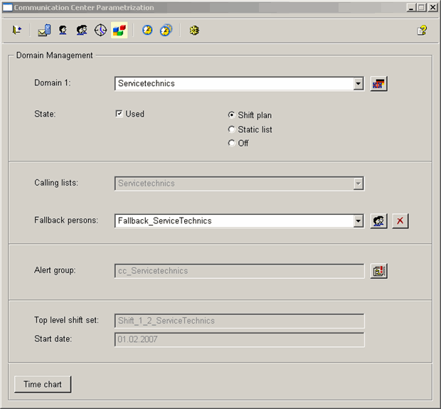 When configuring specific settings, the first step is to create domains (branches). A branch is as already mentioned, a division of a plant into a specific subarea. In our example we create two branches with the names electro-technics and service technics in doing so a static list is used for the branch electro-technics and a shift plan is used for the branch service technics.