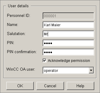 The personnel ID is shown automatically when opening the panel but it can be adapted to company specific guidelines. Enter a 4-digit number into the PIN text field (do not use characters - like the PIN code used for cell phones). The PIN is used for the log-on at the control system. The PIN has to be different for each user. The further settings authorize the user to acknowledge alarms and assign a WinCC OA user to him. The acknowledgement of a transmitted alarm, for example, alarming via telephone works as follows: the user listens to the message of an error and confirms the transmission. The alarm is acknowledged simultaneously with the confirmation if the user possess the appropriate rights (the check box acknowledgement rights has to be checked for the user and the assigned WinCC OA user has to possess acknowledgement rights).