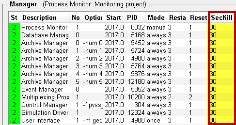 The function pmonGetSecondsToKill() returns the set seconds to kill for a WinCC OA manager. The seconds to kill are set for a manager in the WinCC OA console and shown in the console - see figure below.