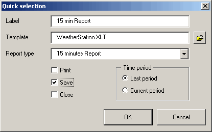 The Reports/New menu option opens a File Browser listing the templates available. After selecting a template, a window opens in which you can select the time period and the type of the report. The last full time range to have elapsed is suggested by default for each report type. This time period can customized, however, using the date and time selection box.