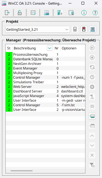 From user's view there are the following relevant user interfaces - the interfaces are listed so that they are easy to understand, regardless of the strict manager architecture. In a typical project process (here using the example of GettingStarted_3.21) there is the following interaction with the user. After the start of WinCC OA the project administration is opened and after the project start the console followed by the log viewer.