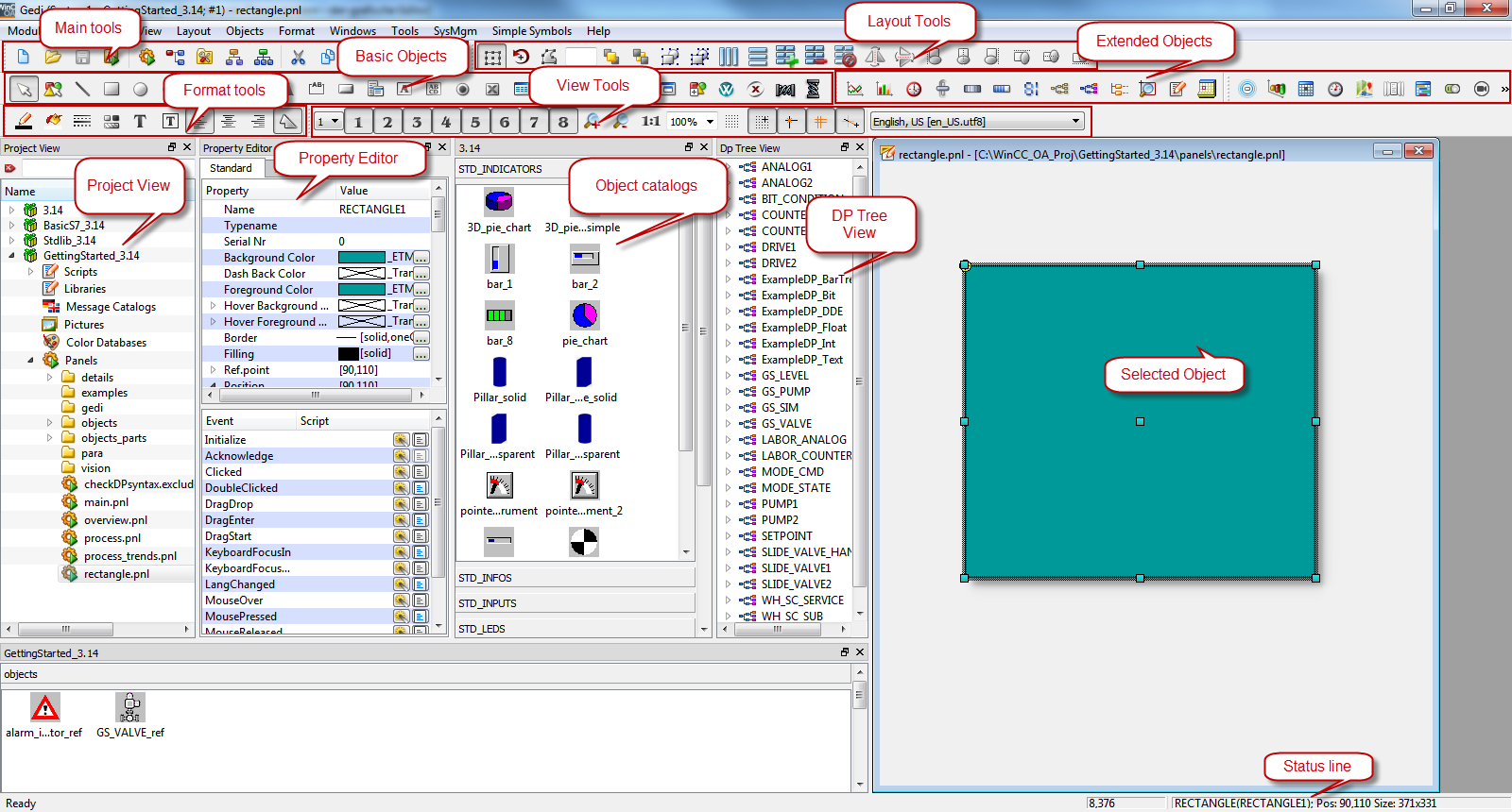 In WinCC OA, all graphical user interfaces are called "Panels". Regardless of whether the panels are overview images, process images, detailed images or operation and information dialogs - everything in WinCC OA is technically a "panel". They are created with the graphic editor GEDI which we already got to know in the chapter After the Start - first Steps. Switch to the graphic editor or start it via the console [rightMouseClick] on the entryUser Interface -m gedi and click the entry Manager Start).