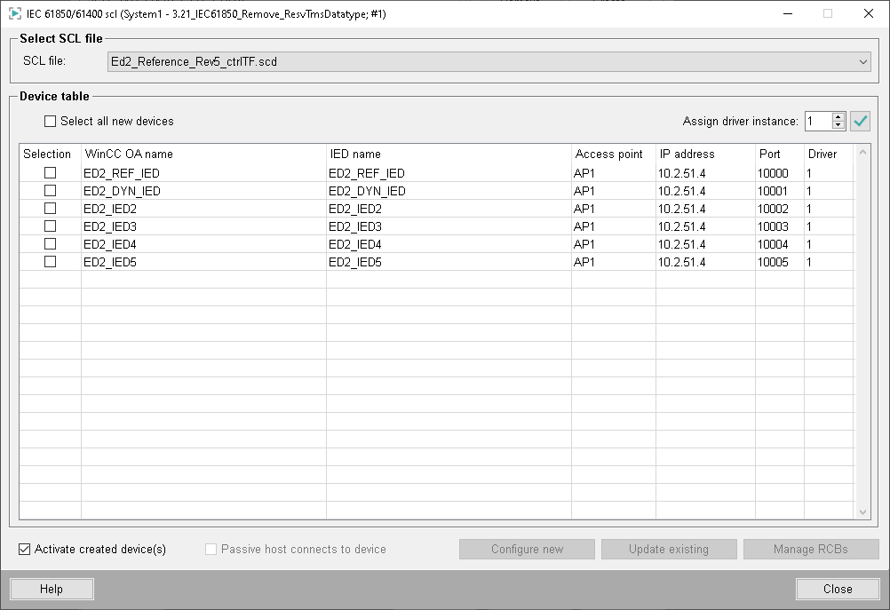 The "Manage RCBs" dialog applies to preassigned RCBs only. It allows you to add RCBs that are available in the browsed SCL file but not within your project. You can also remove RCBs which have been created in your project but do not exist the browsed SCL file.