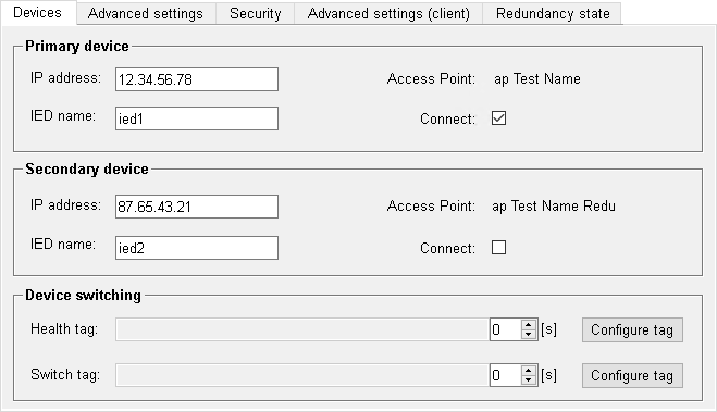 This panel allows to enter the IP addresses and IED names. A secondary device can only be configured if the option redundant device is enabled.
